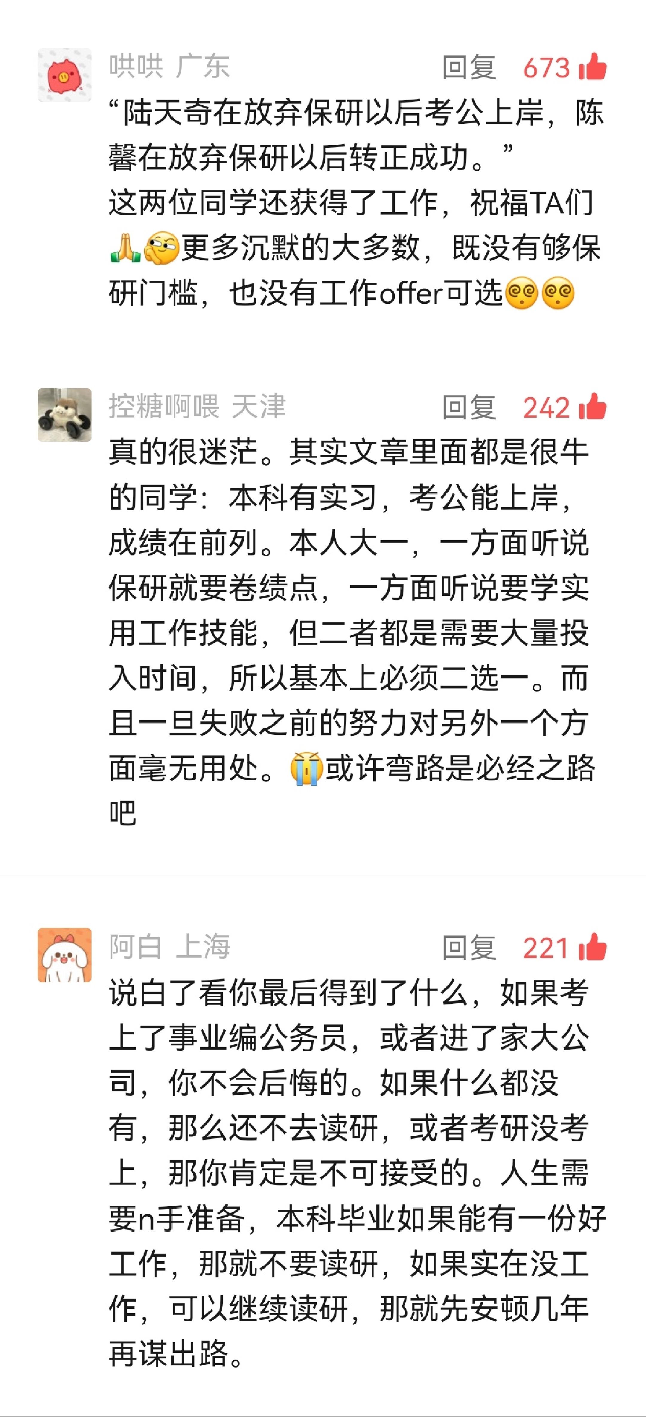 当然,理工科就业还是不错的,貌似考研人数下降也主要是文科生的数据下降(未求证,是在别处看到的),这样其实算醒悟的早的,文科读研确实在就业上提升的不是那么明显,如果你仔细思考了自己的专业、实力、兴趣爱好与个人规划过后再做出考研考公的决定,相信那就是你想做的。