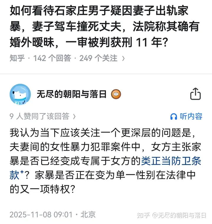 不管从数据还是个例来看,女性施暴者一点也不少,但法律和舆论往往忽视受到家暴的男性,法律如果真要公平,就应该从经济控制和冷暴力入手,还有动手的先后顺序来对家庭暴力进行定罪,而不是“你男她女,肯定是你错了”