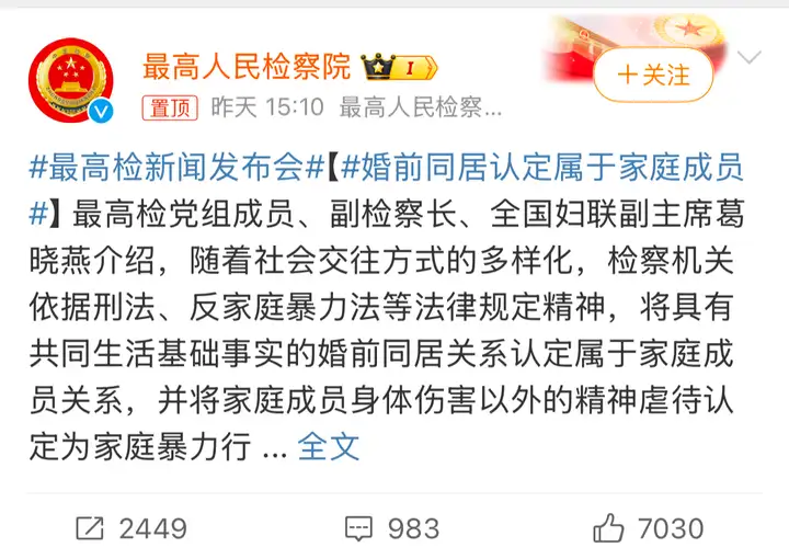 “最高检党组成员、副检察长、全国妇联副主席葛晓燕介绍,随着社会交往方式的多样化,检察机关依据刑法、反家庭暴力法等法律规定精神,将具有共同生活基础事实的婚前同居关系认定属于家庭成员关系,并将家庭成员身体伤害以外的精神虐待认定为家庭暴力行为。”