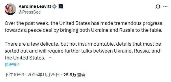 △美国白宫新闻秘书莱维特25日发布声明称:“还有一些棘手但并非不可克服的关键细节亟待解决“。 按25日披露的美方官员的消息,乌克兰已同意这项和平协议,“还有一些细节需要解决”。至于这部分需要解决的“细节”,美国白宫新闻秘书莱维特于当日稍晚时的声明中也有所提及:“还有一些棘手但并非不可克服的关键细节亟待解决,这将需要乌克兰、俄罗斯和美国之间进行进一步谈判。”美国总统特朗普也在随后表达了对达成协议的期待,他认为俄乌和平协议已“非常接近达成”。