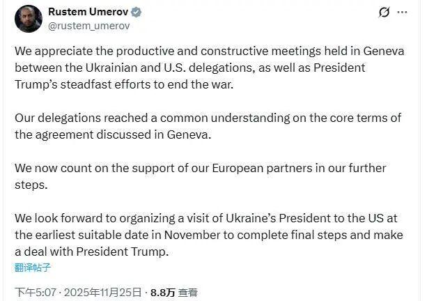 △乌克兰国家安全与国防委员会秘书乌梅罗夫25日在社交媒体上发文,称美乌双方代表团已就在日内瓦讨论的协议的核心内容上,达成一致 乌克兰国家安全与国防委员会秘书乌梅罗夫则于同日在社交媒体上公开表态称,美乌双方代表团已就在日内瓦讨论的协议的核心内容上,达成一致。