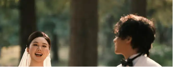 这张照片中,女方盯着摄像头,而不是看着男方。