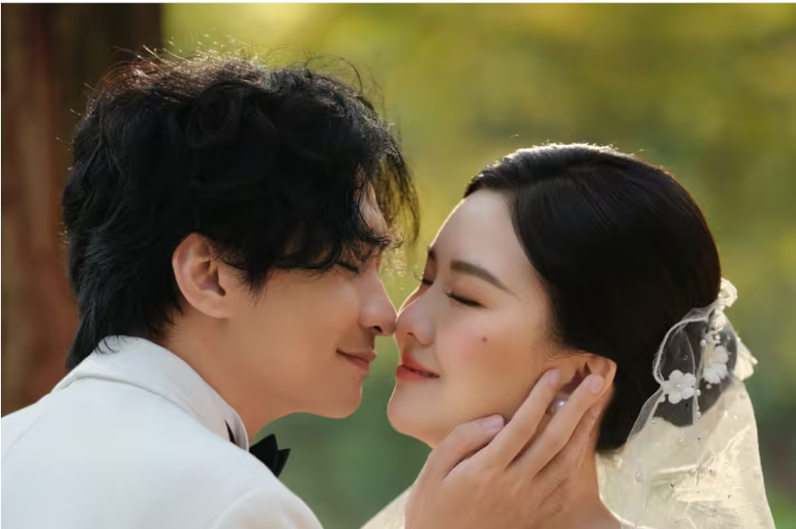 这张照片中,女方其实也没有盯着男方,而是闭眼。