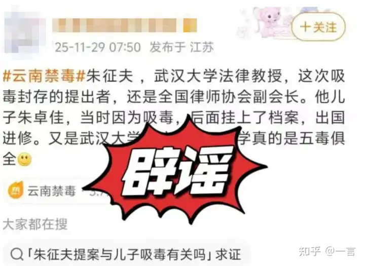 比如就拿这段时间最火的行政违法记录封存这件事,引爆舆论的无非就是南通文旅的那句“哪位少爷吸了”,然后一堆人开始讨论,进而马上有人扒出来朱征夫,说他是武汉大学教授,说他儿子是吸毒人员所以才提案要求进行违法记录封存。说这就是法学界的一些大佬想要夹带私货,为二代铺路,将来好进入体制。