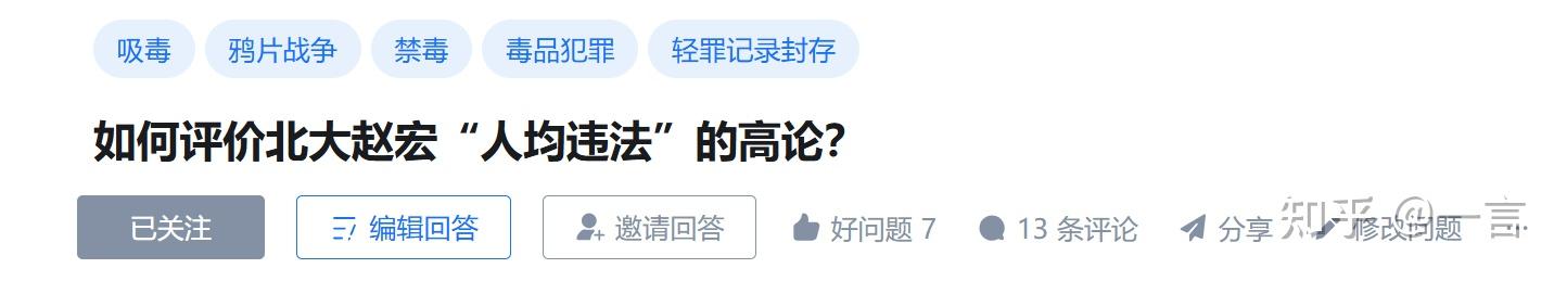 再比如知乎上这两天另一个很多人问的问题,如何评价北大赵宏“人均违法”的高论?意思就是说赵宏也在为毒品犯罪站台,是典型的对西方法学的崇拜。