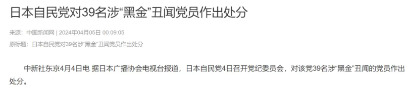 首先是自民党内部处罚,2023年11月日本曝光议员黑金丑闻后,自民党党纪委员会在次年4月,对39名涉“黑金”丑闻的党员作出处分。