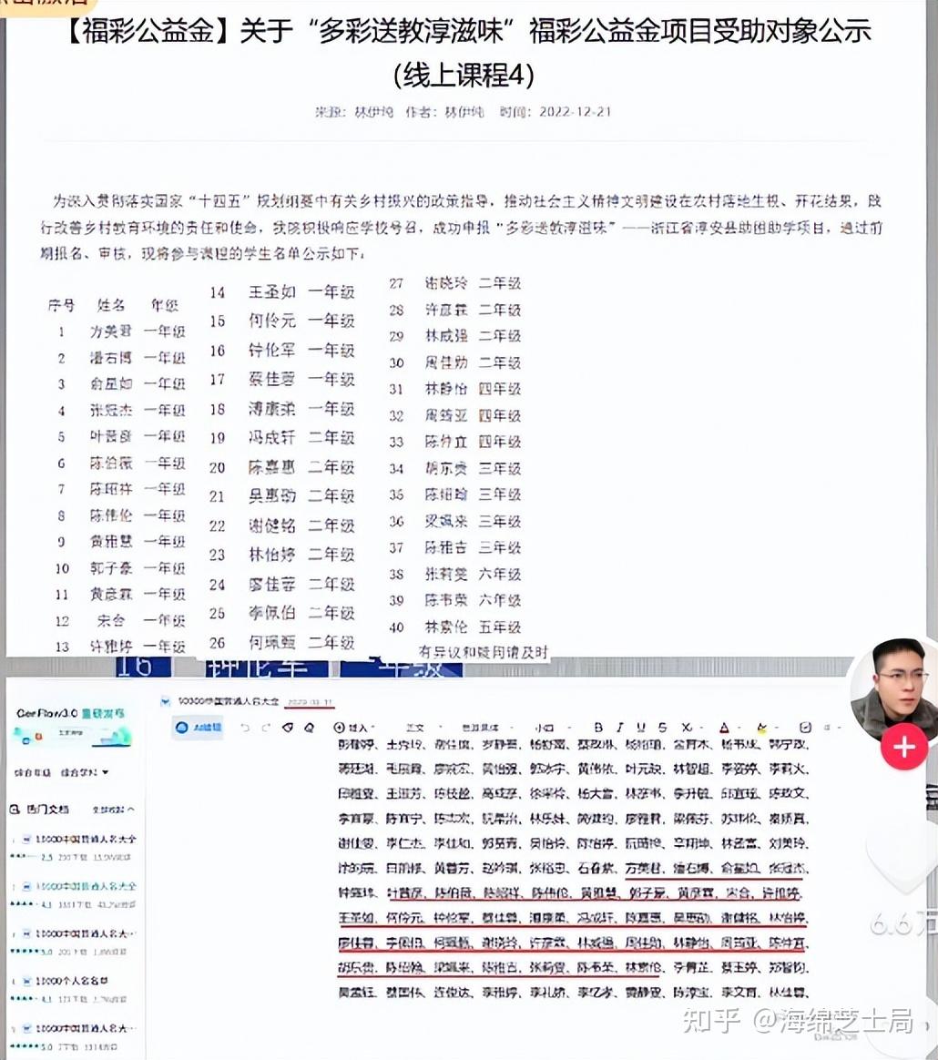 这是福彩项目助困助学项目,找到第一个名字:方美君,潘右博......再找到那个百度文库的名字,这个人还学聪明了,不从第一个复制,他是从中间开始复制的,受助名单顺序是一模一样。