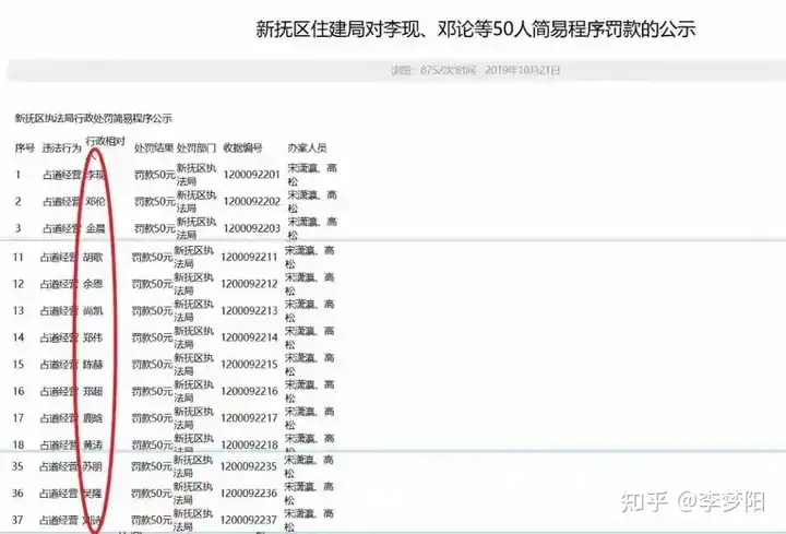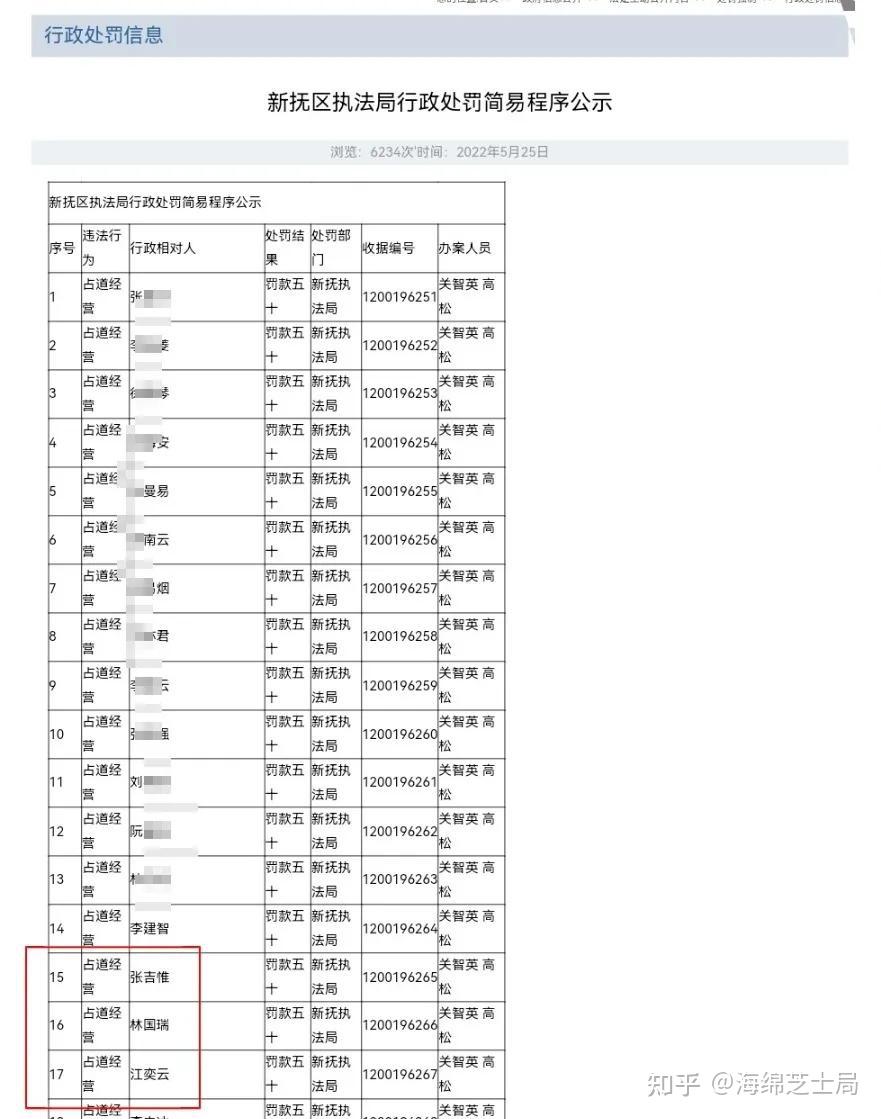 2022年这几个名字还出现在某市政府官网,因占道经营被一人罚款50元。