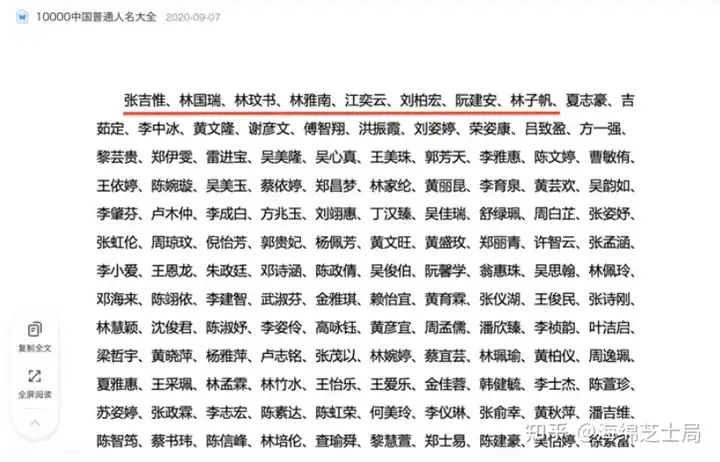 这几个人名的最终来源都是那个 1000 普通人名的百度文库而已,但是百度里面人名文库并不止一个,实际上我搜了一下,如果拿“人名”或者“人名大全”,“普通人名”这些关键词去搜,这个文库都不会在前面出现。那难道这么多做假账的人,他们造假人名的方式都是一样的去百度差不多的关键词?并且在搜索结果里都选择了同一个文库去抄?
