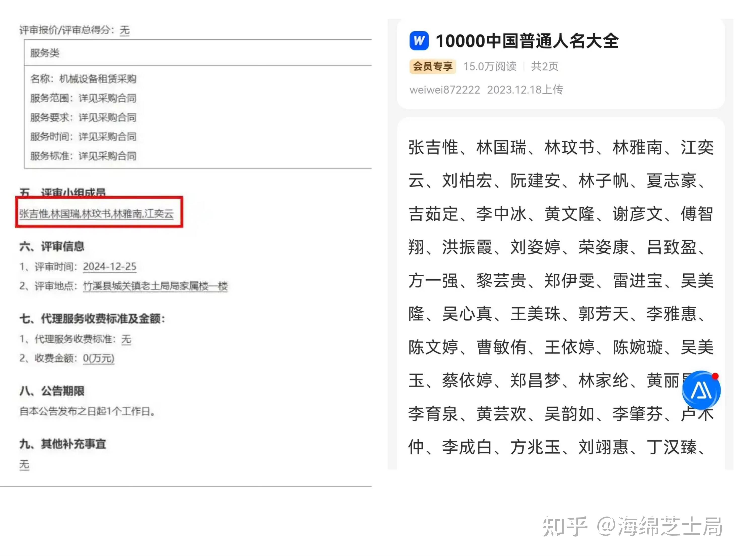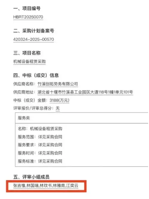 湖北某住建局一项3188万元的政府采购项目,其评审小组成员名单也出现了这前五个名字,连排列顺序都一模一样,顺序都懒得改。