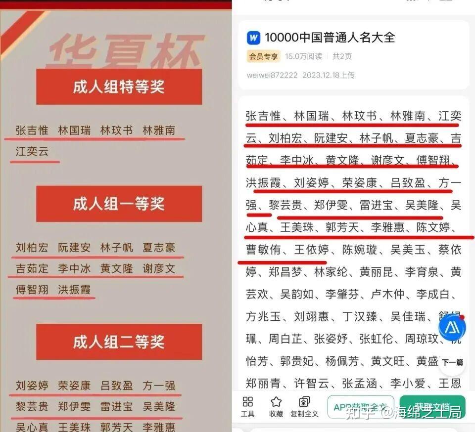 百度文库里里面有个文档叫做10000中国普通人名大全,仔细看这最前面的五个名字,获奖名单跟这个一模一样。