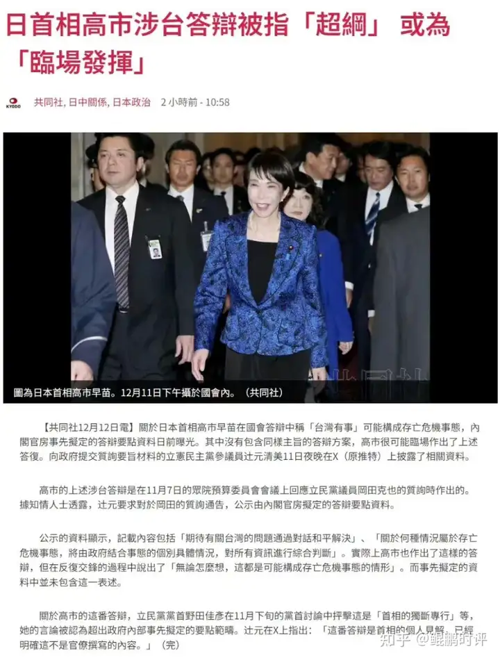因此,日本方面认为导致目前的局面,是高市本人临场发挥,加戏了。