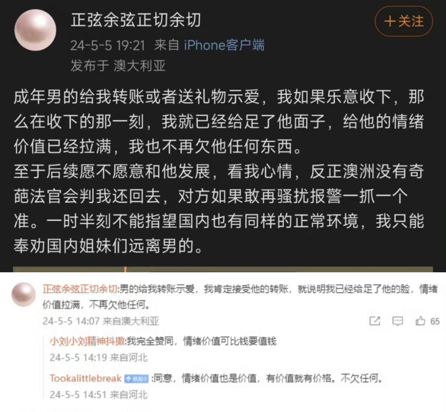 类似的还有“情绪价值”,她们自己难哄,事多,但是拿出情绪价值就可以平账。因为自己难哄,所以男朋友送了礼物,“没送到心坎上”这就是男生没提供情绪价值。虽然没送到心坎上,但是他还是表示感谢,给男朋友夸夸/抱抱/亲亲,或者生日礼物送“精美手写小贺卡”,这就是天大的情绪价值。就平账了,甚至还能得出男朋友还欠她的结论。让她索取更多礼物索取的理直气壮。