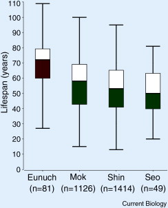 研究者查了同住在皇宫的皇族男性——平均只有47岁左右。皇帝和王子们的生活条件肯定比太监好,但他们死得更早。