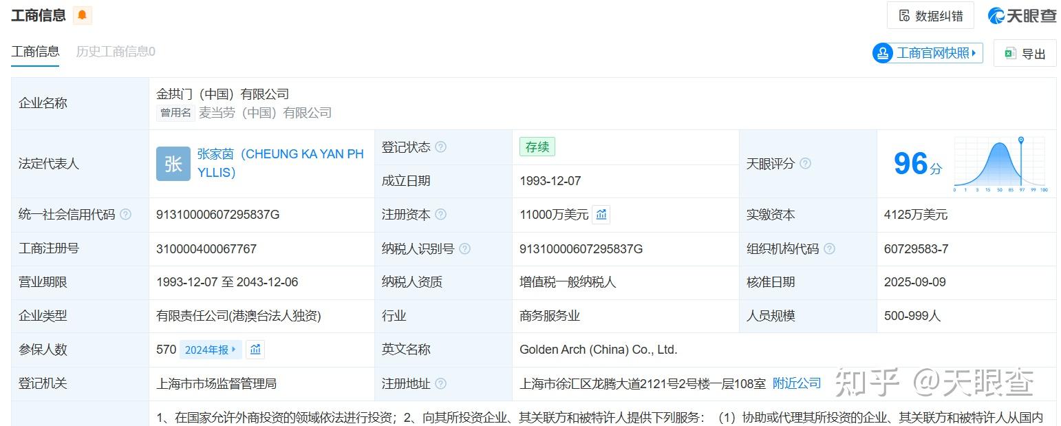 (中国)有限公司】(曾用名:麦当劳(中国)有限公司)成立于1993年,法定代表人为张家茵。