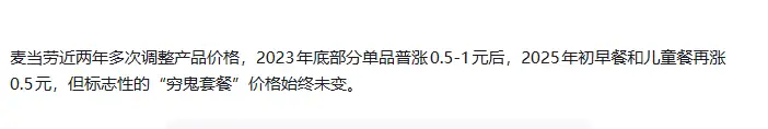 ”的活动,以低价策略吸引消费者。为了在竞争中占据优势,2019年3月,麦当劳推出“1+1随心配 ”套餐,消费者花12.9元就可从红区和白区各选一件商品,买到汉堡+饮料或甜品的组合。尽管该套餐的价格曾在2023年涨到13.9元,但“穷鬼套餐”的说法在网络上被保留下来。事实上,近一年来,麦当劳曾有过两次不同形式的调价。2024年12月,麦当劳官方称,麦乐送