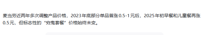2023年虽说穷鬼套餐的价格没动,但是麦当劳来了一次全面调价,平均涨幅3%,放到麦当劳进入我国市场后,都属于一次比较大的调价了。