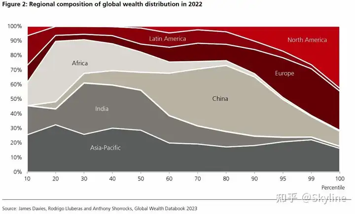 连个图都看不懂,就拿出来。本图展示的是国民财富全球排位(Global Ranking),而不是国内差距(Domestic Inequality)。图里“ Global wealth distribution”这字应该不难认吧。这图正好说明美国是一个发达国家,即便是一个普通的美国中产阶级,如果放到全球范围内看,他的财富水平往往也能轻松进入全球前10%甚至前5%,所以美国(北美)在图表的最右端(95%-100%)占据了统治地位。在世界范围内看,绝大多数美国人都属于“全球富人”。