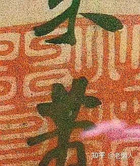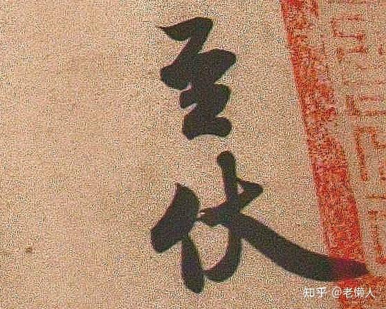 下面这张提高亮度和锐度。字迹上有红色印色,是印色挥发后留下部分,因此印原本就是盖在字上面的,书法家一般都不会在印上写字,印色在下比较容易挥发,毁坏字迹或者是其他问题。当字好似写在印上的时候,说明印色被挥发了,代表了这个时间比长较久。