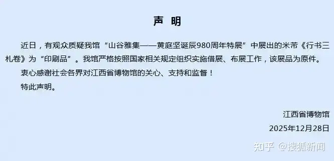 江西省博物馆在声明中强调,展品是从故宫借展的“原件”,借展流程合规,这种回应看似措辞强硬,却毫无信息含量,对于书法博主提出的诸多问题只字不提,怎么让人信服?