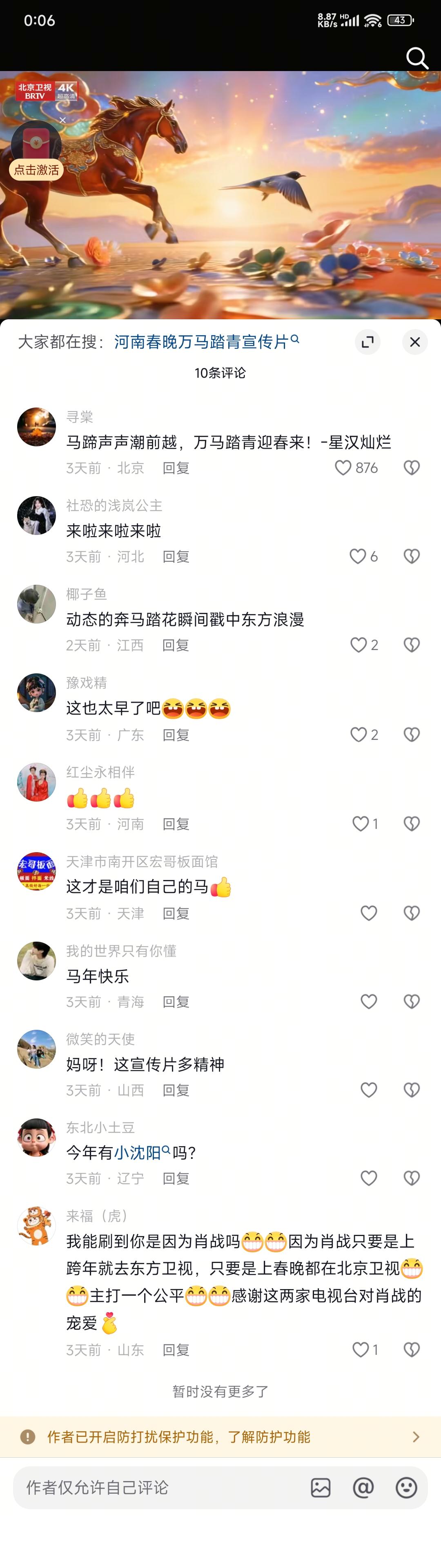 北京卫视这个旗马踏花,1800+的点赞,我前天看的时候有4000多个评论,前排几千点赞的全部是骂它的。然后它们不仅不删视频道歉,还设置了仅允许自己评论,今天一看,好家伙评论删除的只剩下10条了。 看看,就是这么嚣张,反对它的声音全部消灭,修改互联网记忆。就是要把旗马踏花坚持到底,就是这么有恃无恐。 这就说明了,这个片子不是卫视里某个人自己在挑衅华夏,而是北京卫视作为一个首都官方媒体,它们整体的意志坚决要这么干的。 发布于 2025-12-30 00:22・陕西 赞同 1801 条评论分享 收藏喜欢 收起