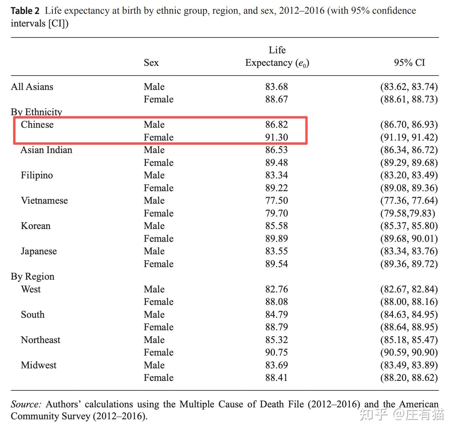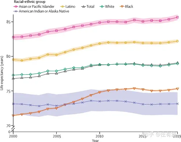 图1是发在Lancet的一个研究,关于美国不同族裔的预期寿命,注意看粉红色那条线,亚裔和太平洋裔是所有族裔中预期寿命最长的,达到了85岁。