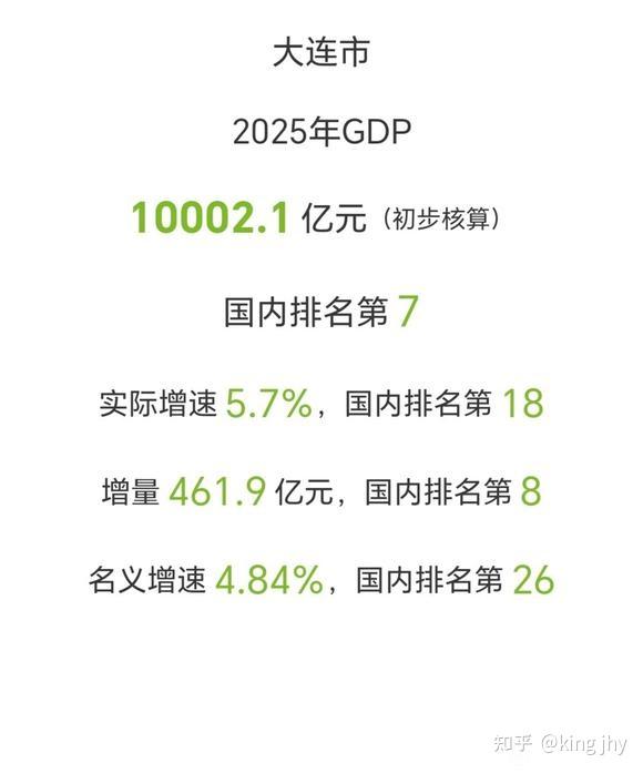 图源大连市统计局 根据大连市统计局数据,2025 年,大连市实现地区生产总值(GDP)10002.1 亿元人民币,同比增长 5.7%,超出全国 GDP 增速(约 5.0%),估计也会领先于多数区域性城市增速。