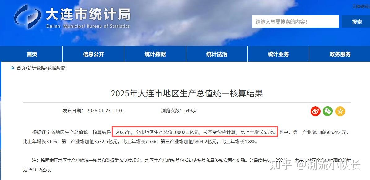 根据大连市统计局数据,2025 年,大连市实现地区生产总值(GDP)10002.1 亿元人民币,同比增长 5.7%,超出全国 GDP 增速(约 5.0%),估计也会领先于多数区域性城市增速。