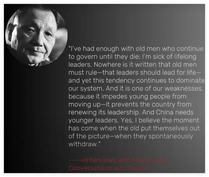 邓小平同志,废除领导职务终身制,把禁止个人崇拜写入党章,使得中国人真正走出了5000年的封建统治,人民的头上不再有神仙和皇帝;实行改革开放,使得中国人5000年来第一次不再为吃饱饭而发愁!