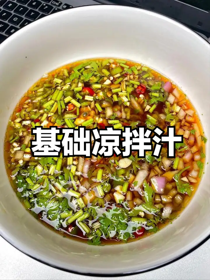 基础版凉拌汁:记住22111公式,即2勺生抽+2勺香醋+1勺白糖+1勺蒜末+1勺香油,再加点葱花、小米辣,这版凉拌汁主要靠生抽和白糖提味。