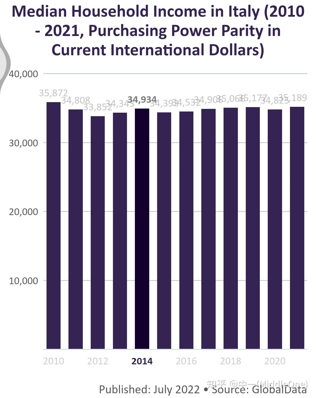 但欧债危机后,意大利GDP开始萎缩,家庭年收入中位数(未确认税前还是税后)也不涨反跌。
