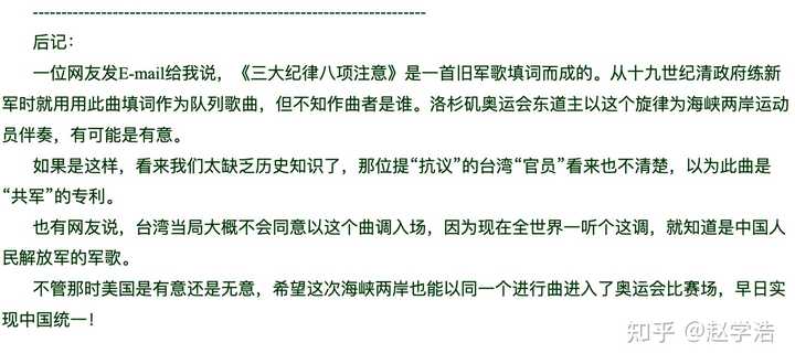 被误导的杨汝清教授补充的后记 因此,中华台北代表团入场曲为《三大纪律八项注意》,只有采访当时中华台北代表团的成员,才能得到更加确切的一手资料了。