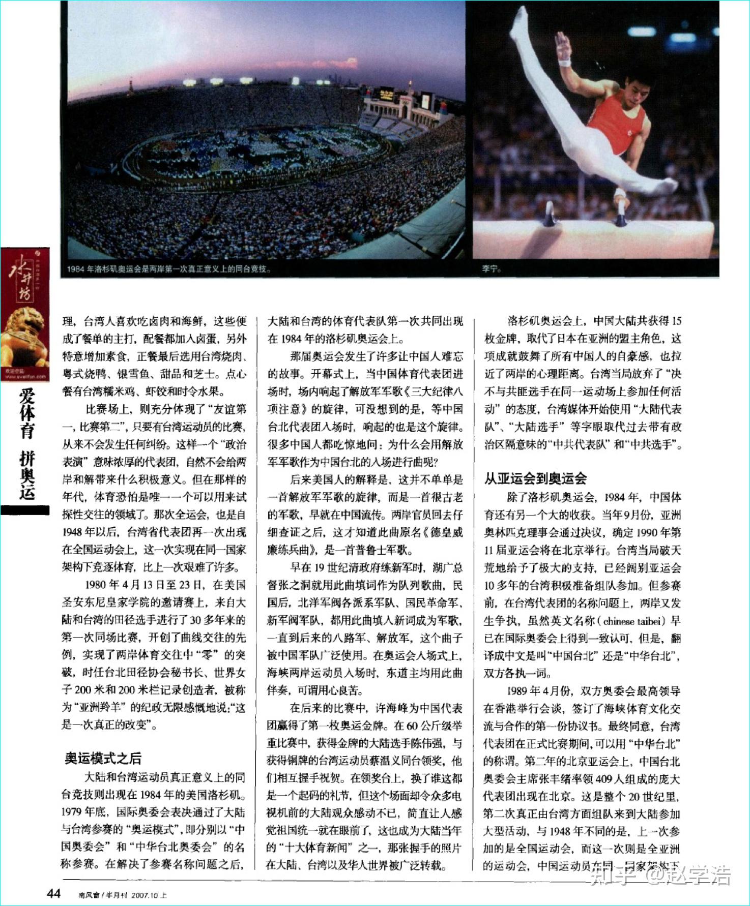 大陆和台湾运动员真正意义上的同台竞技出现在1984年的美国洛杉矶。1979年底,国际奥委会表决通过了大陆与台湾参赛的“奥运模式”,即分别以“中国奥委会”和“中华台北奥委会”的名称参赛。