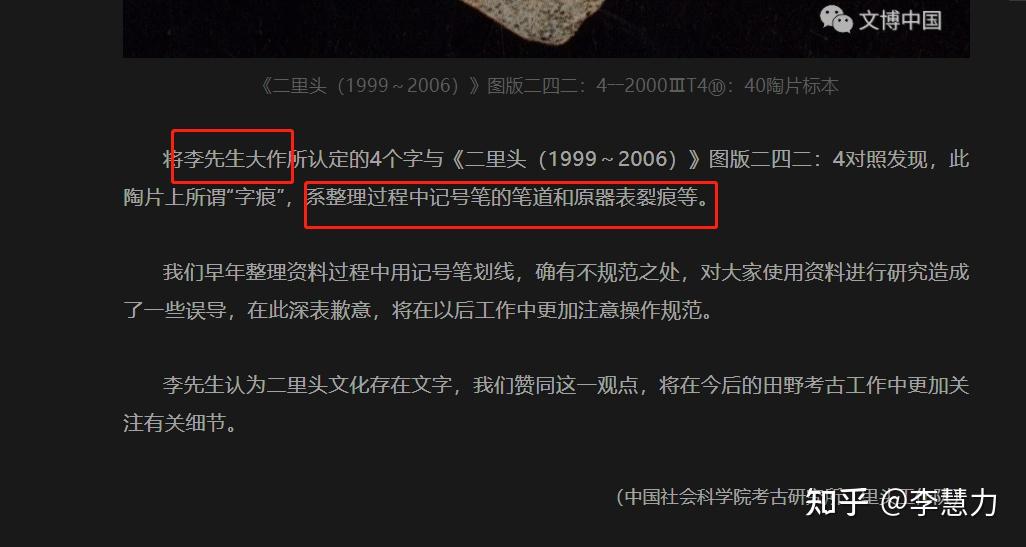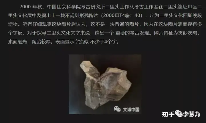 - 李研究员认为,该片陶片“证明二里头文化有记事文字,按照二里头文化是夏文化的学说, 夏文化有文字的学术判断因此得以证实。”