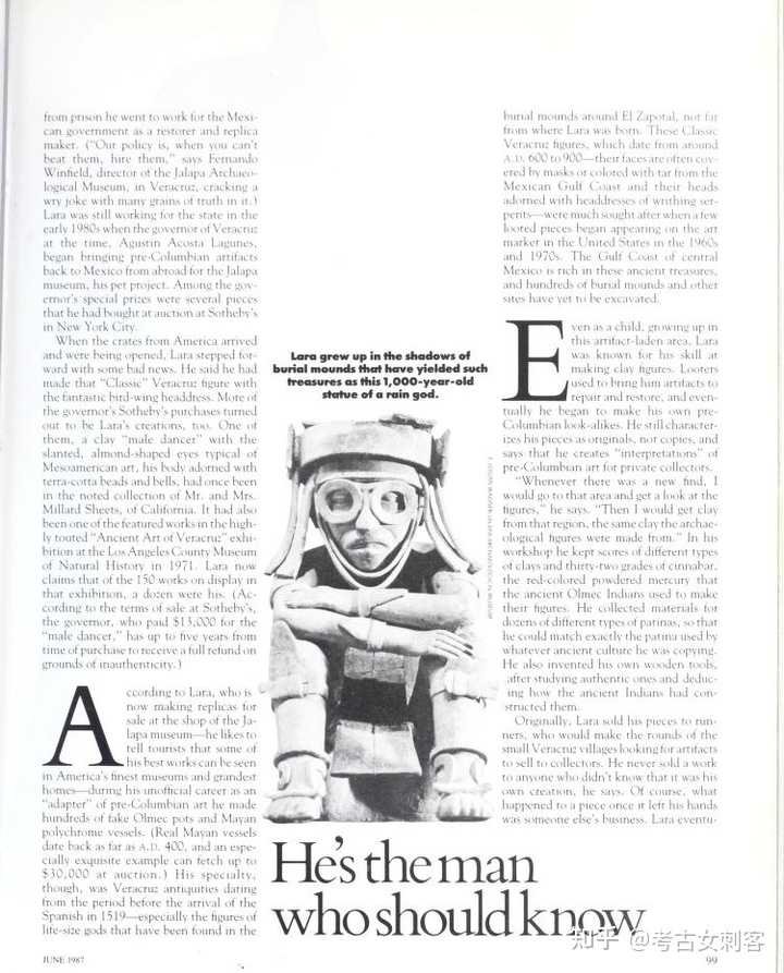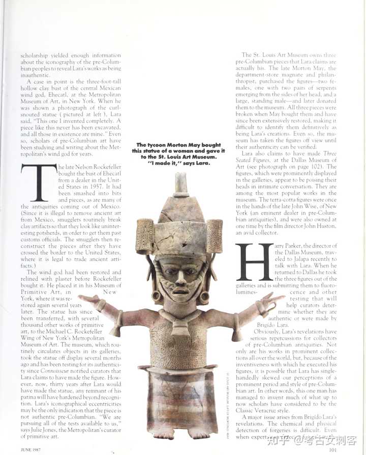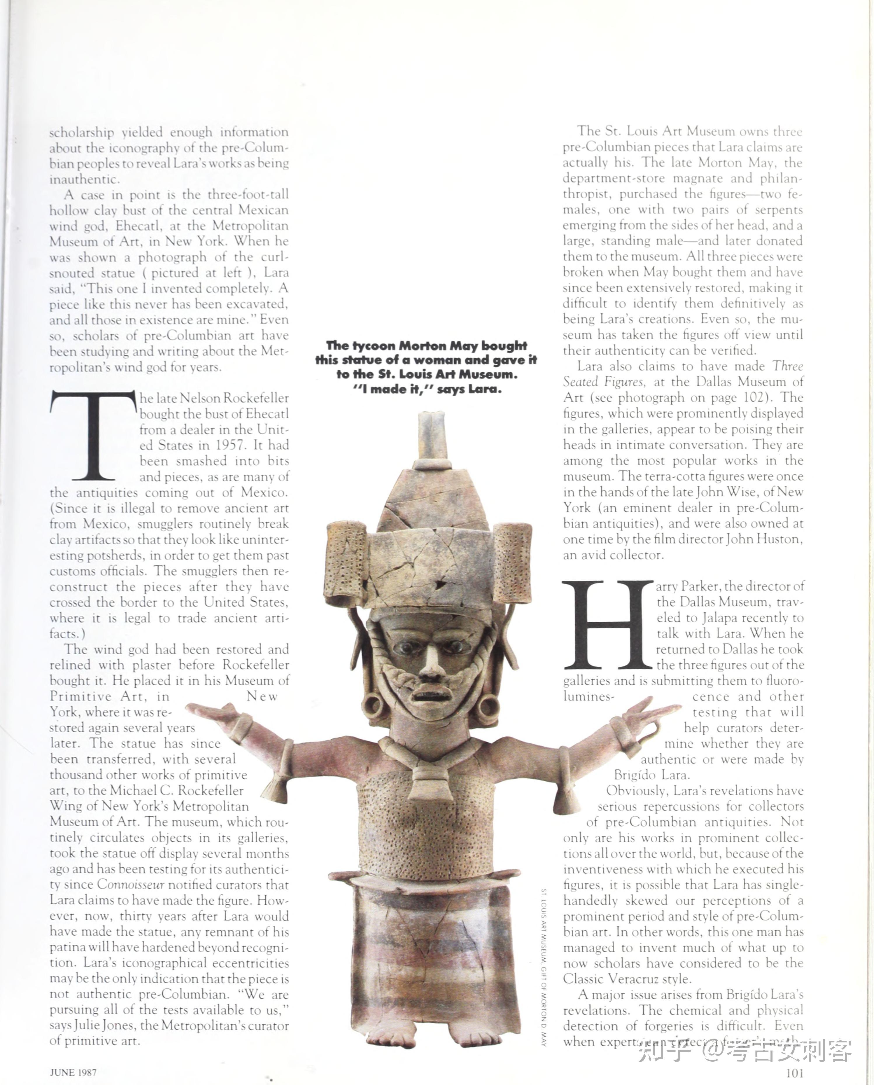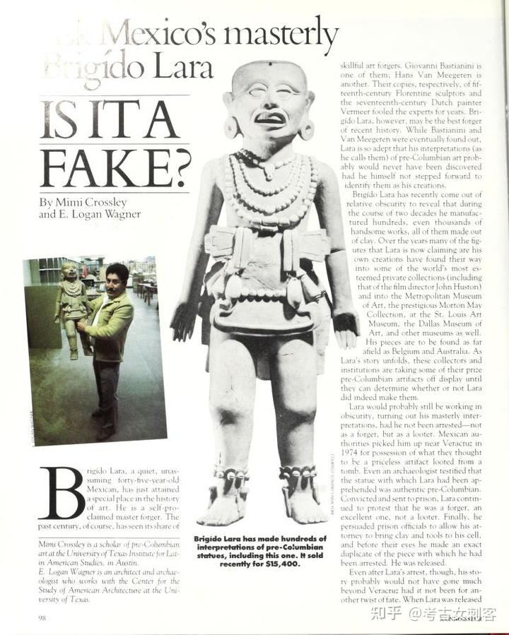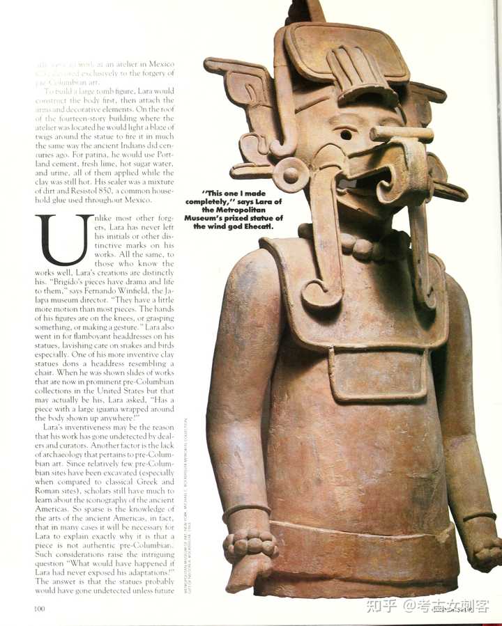 在大都会艺术博物馆,拉拉认出一尊3英尺高的中美洲风神埃赫卡特尔雕像是他的作品,这尊空心陶瓷雕像最初可追溯到公元 700 年至 900 年之间,由纳尔逊·洛克菲勒于 1963 年捐赠。一群专家在实验室测试得出了模棱两可的结果。拉拉从未去过纽约,他对这件作品及其构造非常了解,足以表明他至少亲眼目睹了它的制作过程。但其他细节似乎与这一结论相矛盾。