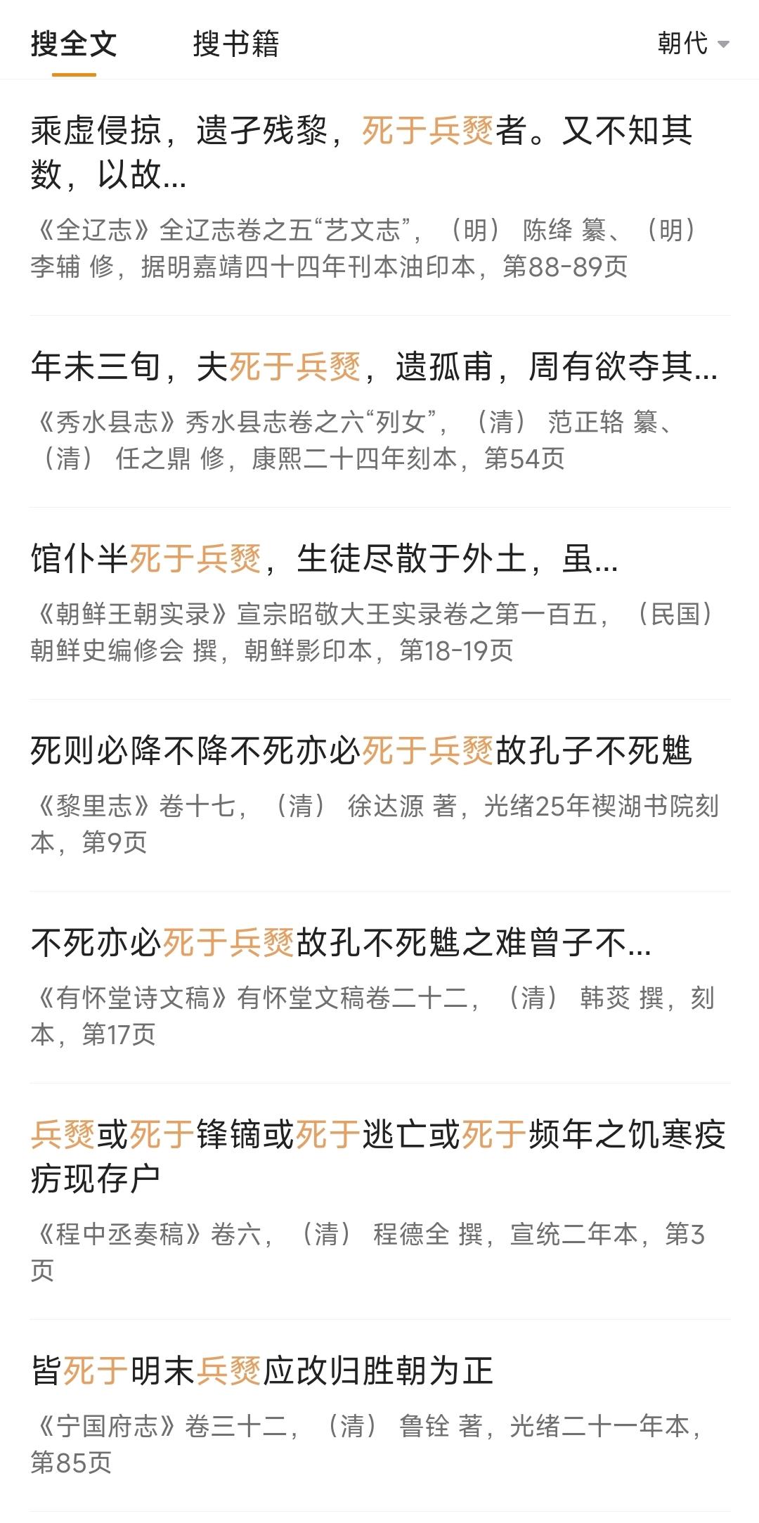 关于“死于兵燹”这个说法,一开始我是凭感觉用的,评论说用词不当,我查了一下词义,觉得确实如此,于是改了,后来又用“识典古籍”app查了一下古籍原文,好像也不是不能用(以下截图只截了一部分,其实还有不少),于是又改回来了,看到的各位可以自行判断——当然对于问题而言,这不是重点,只是一个用词是否恰当的插曲。这样的讨论也挺好的,越辩越明嘛。