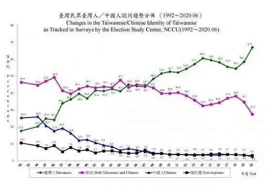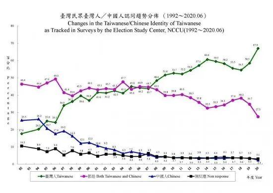 台北的政治大学选举研究中心,从1992年开始,每年统计、调查两个东西:民众的国族认同感、以及统独立场。这是学术机构做出的普遍性统计,这么多年来每年持续跟踪,是这个领域内公认最有公信力的民调。