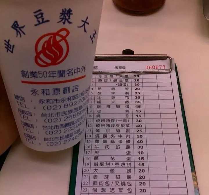 我特意跑去 永和大王的第一家店铺,喝了 2大杯豆浆,一杯热的、一杯冰的。味道很好。服务员听出了我们的大陆口音,就指着桌子上的肉松面包,拖着长腔问我: