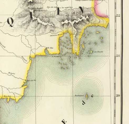 下面这幅1795年的地图似乎也可作为佐证。在该图中,白龙尾岛标为黄色,和越南的颜色一样,而和中国的红色不同。虽然不能作为越南享有主权的证据。但是最起码可以证明,早在18世纪末就已经有这个岛屿属于越南的说法了。