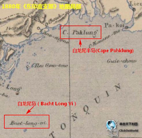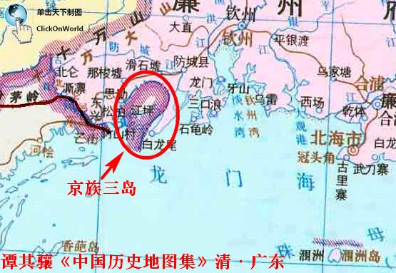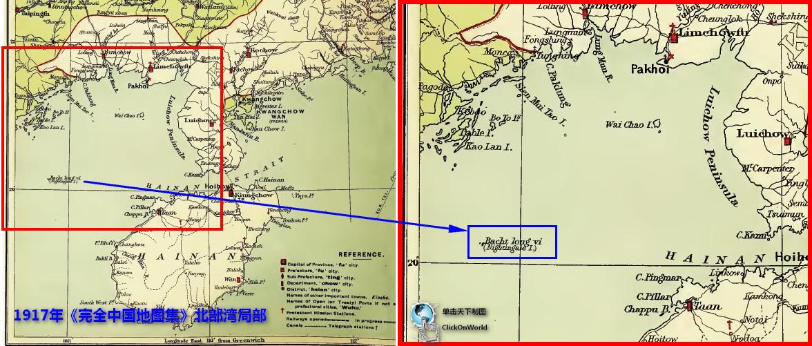 上图虽然含糊不清的在北部湾画出了几个小岛,但一方面没有白龙尾岛准确位置相符的,另一方面也没用标注出该岛。