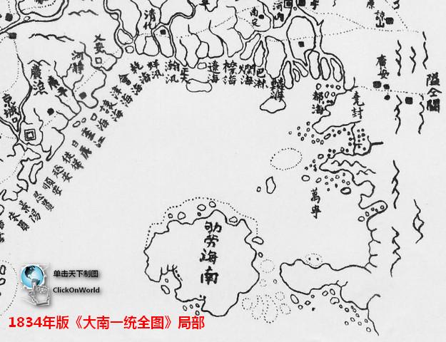 前面我举出了例子,50年代以前中国地图上并没有白龙尾岛出现。但是,同样,在越南的历史地图上,也没有标注出白龙尾岛!下面就是越南官方为争夺西沙、南沙群岛主权而抛出的《大南一统全图》局部(该图将通行地图方向向右旋转为:上西下冬、左南右北)。