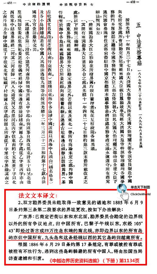 法文版本译文:广东界,已商定芒街以东和东北面,勘界委员会勘定的边界线以外的所有争议地点,归中国所有。巴黎子午线东经105°43′即经过茶古或曰万注岛东端作为边界的南北线以东的所有岛屿亦归中国所有,九头岛及这条经线以西的其它岛屿归属越南所有。根据1886年6月29日条约第17条规定,有罪或被控有罪或被控有不法行为,逃到这些岛屿躲避的所有中国人,将由法国当局访查、逮捕和引渡。