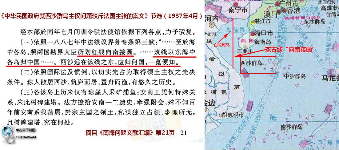 1937年4月《中华民国政府就西沙群岛主权问题驳斥法国主张的案文》就西沙群岛主权问题是这样驳斥法帝关于西沙群岛主权主张的:“经本部于同年七月间训令驻法使馆依据下列各点,力予驳复。(一)依照一八八七年中法续议界务专条第三款:“……至于海中各岛,照两国勘界大臣所划红线向南接画。……该线以东海中各岛归中国……,西沙远在该线之东,应归何国,一览便知。”(摘自《南海问题文献汇编》第21页)