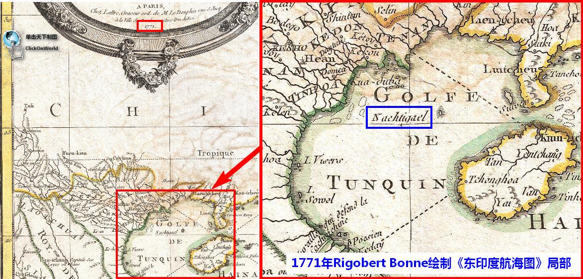 下图就是1771年(清乾隆三十六年)法国著名制图师Rigobert Bonne绘制的《东印度航海图》局部