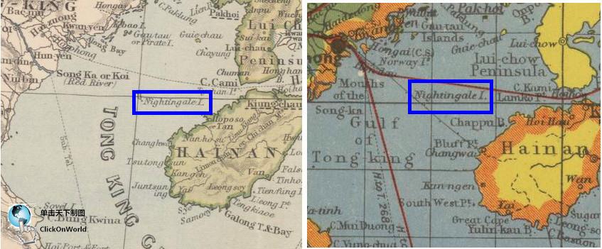 左图为1908年英国地图出版公司斯坦福公司绘制地图的北部湾部分,右图是1944年英国著名地图出版公司george philip & son.(菲利普父子出版公司)绘制的“远东战争示意图”。可以看到,直到二战时期,白龙尾岛的名字仍然被一些国家标注为“夜莺岛”。