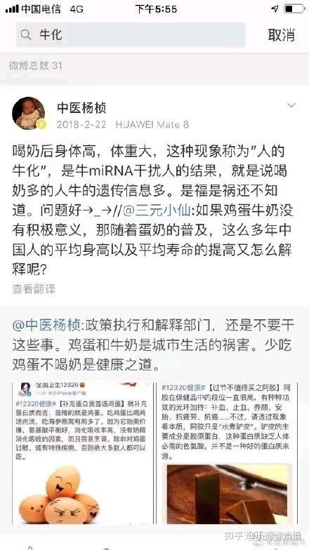 现在还没和原配离婚。我猜明年生物哥过年初二初三不会再回来了,老家人做事他啥都看不惯,有个叫杨帧的中医之前发了个不能喝牛奶的微博,被我姑转发到大群里,现在家族好几户都不让孩子喝牛奶,大概就是下面图片的内容,原文是一个国学公众号的推文找不到了就借用知友的图。当时朋友圈一堆长辈在转那文章,配文牛奶是西方毒害我们的阴谋……