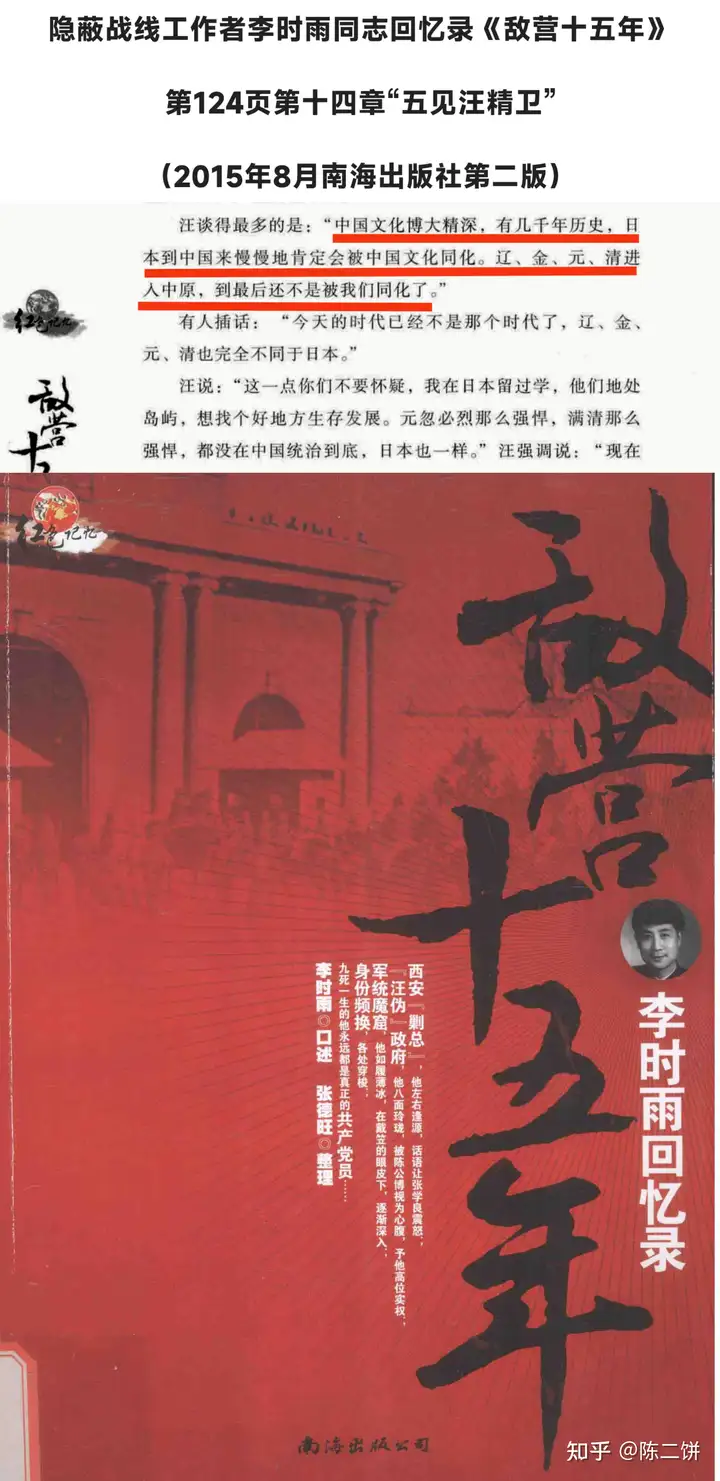 我党著名的地下工作者李时雨同志,在晚年的回忆录《敌营十五年》第十四章“五见汪精卫”中,披露了他1939年12月与汪会面时,此贼侃侃而谈的一番荒谬言论。