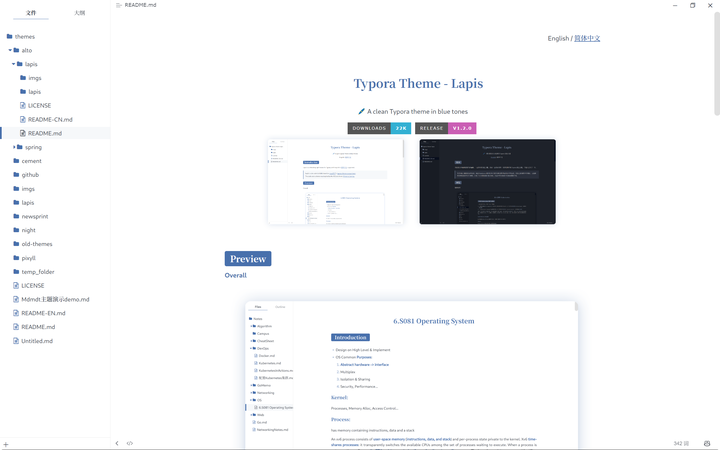 但是在做那个笔记项目的时候,我全程使用 Typora 来完成,当时便选择了 YiNN 大佬的 Lapis 主题,其设计真的蛮喜欢的: