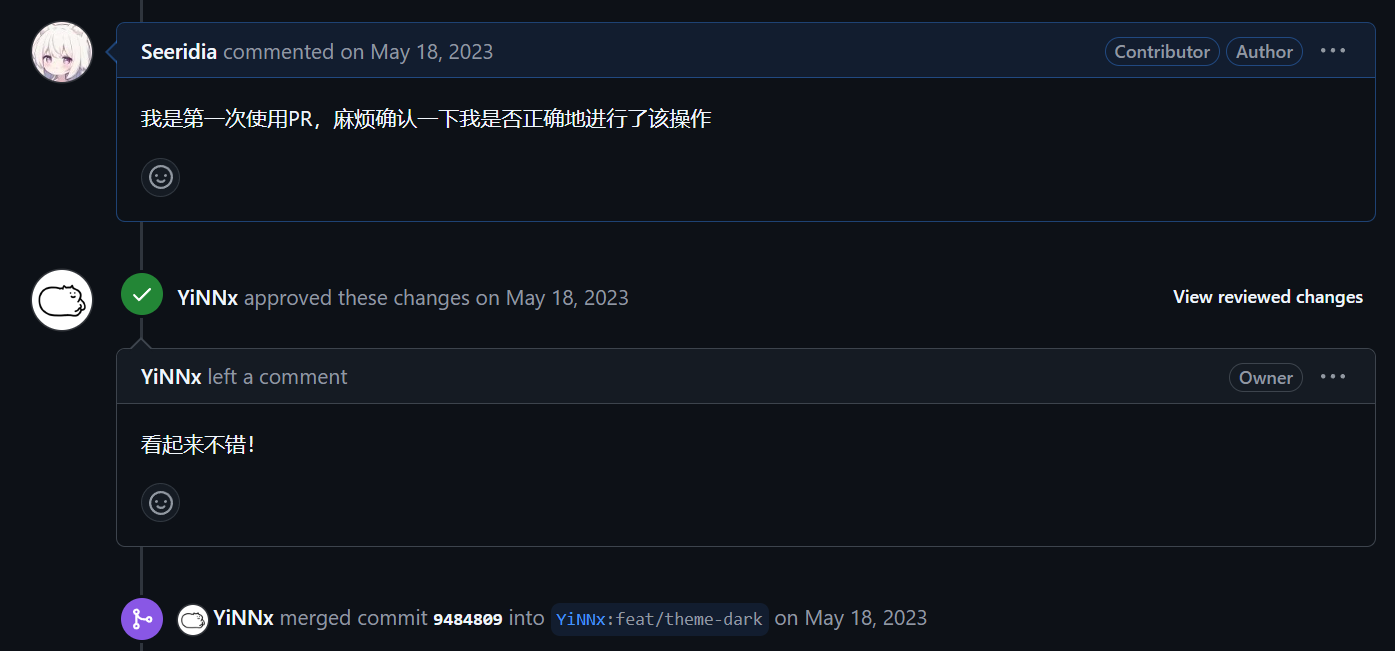 在大佬回应后,我也尝试了做出了第一个 PR(简单来说是帮他们改\写一些代码,然后也放进去)