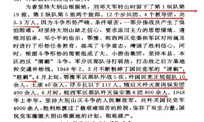 粟裕军事文集 而其实不需要举远的例子,粟裕只要举一下大别山的例子即可得知。刘邓跃进大别山,可谓无后方无补给,需要自己建立根据地,自己筹集军粮棉衣等等,直到转移出淮北才得到了补给,期间很多行为就是“非常手段”(虽然理想和规定上还是以维护军纪为正确)。而刘邓率领一、二、三、六四个纵队共12.4万人渡河,经历鲁西南战役,接着挺进大别山,人生地不熟的情况勉强建立了根据地,1947年11月白崇禧指挥国军对大别山进行围剿,到48年3月转出时只剩下5.86万野战军,直接没了接近七万,占领的20多个县城一个也没有,全部丢了,据说留守3.3万人不知道情况如何(估计在国军围剿下所剩无几),反正结果沦为打国军数十数百人(而且不知道战绩有没有吹水夸张),而且不是正规军,可以基本无视这个战力。